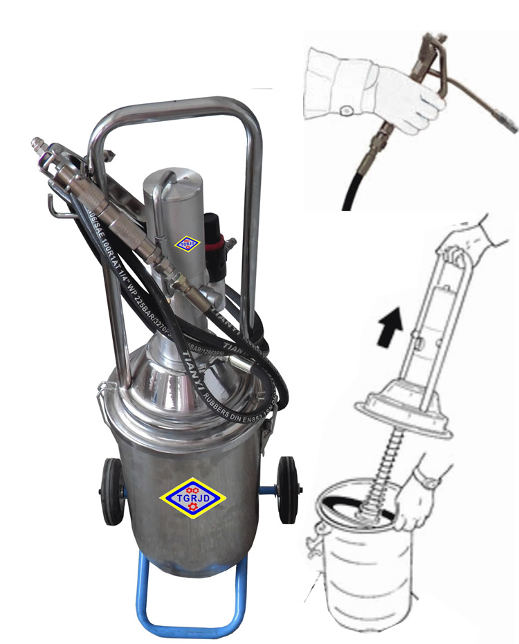 68313-气动黄油机-采用不锈钢外桶,外形设计新颖美观,操作机构人体学设计,使用轻巧省力,搬移方便。 配置有带丝杆的施压装置,使用更加方便,输出压力高,运用自如。 68313-气动黄油机是以压缩空气作动力,利用气缸活塞驱动泵油柱塞往复运动,从而输出压力润滑油脂的一种装置。其具有结构简单、使用维护方便、安全可靠、可降低劳动强度、提高工作效率等特点。 该润滑泵主要适用于冶金、港口、汽车、工程机械及各种有气源场所的润滑油脂的加注。 改进型桶盖固定方式,操作更加方便快捷。