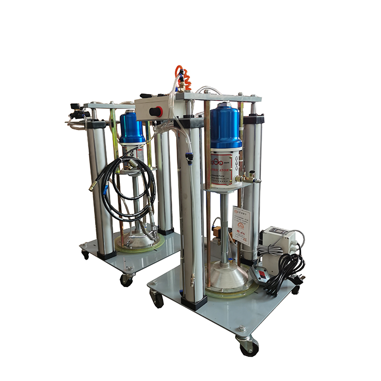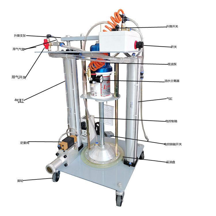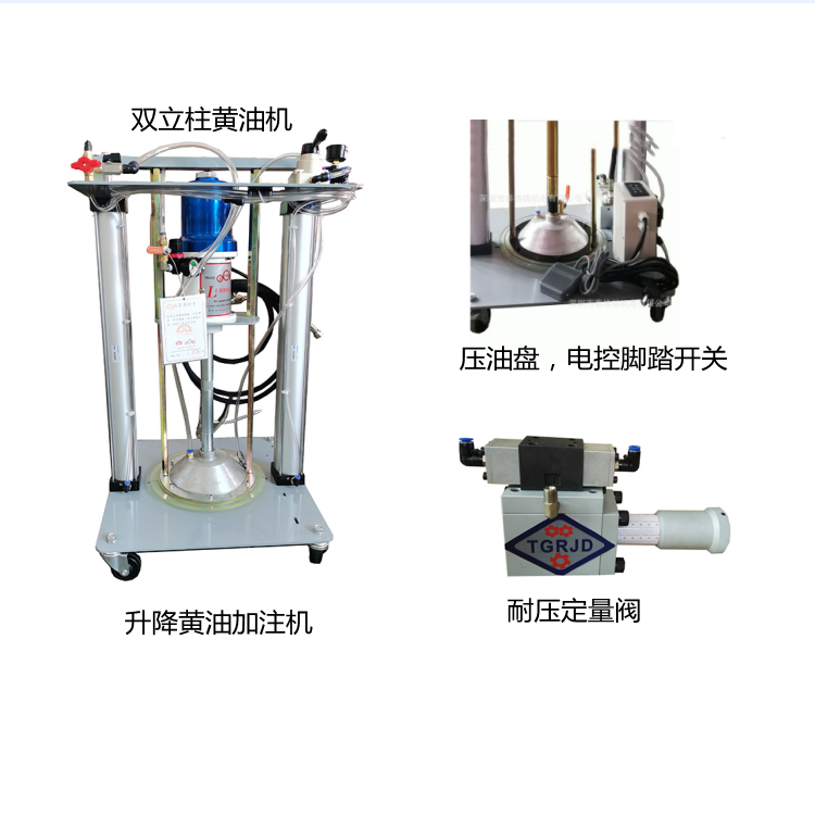 品名:工业级双立柱定量加油机TGR6410-D150 品牌:TGRJD 型号:TGR6410-D150 【工业级双立柱定量黄油机TGR6410-D150设备描述】 工业级双立柱定量黄油机TGR6410-D150配置的气动柱塞泵、压油盘、空气升降机及其他组合件专为抽注高粘度材料所配。高粘度材料专用的压油升降机构和压油盘构造有超强的挤压力量。从根本上弥补了附着在材料表面的通过吸附力把材料集中于底阀周围帮助泵吸收的随动板对高粘度油料无济于事的缺限。广泛用于油灰、粘接剂、润滑脂、印刷油墨等高频率集中定量供给的工作环境。 升降机的工作可通过转换阀进行升降操作,泵和压油盘也随着升降。当油桶内的材料用完后也可通过升降机的工作进行油桶更换。
